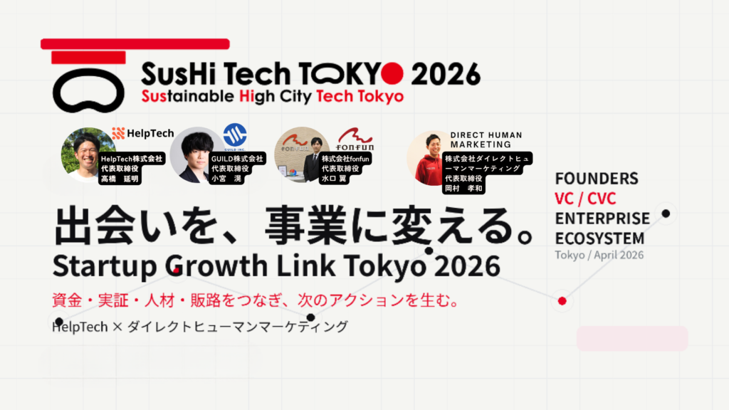 2026年4月21日(火)「SusHi Tech Tokyo 2026」パートナーイベント「Startup Growth Link Tokyo 2026」に当社代表の水口が登壇いたします